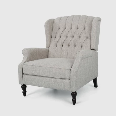 Gift yourself the perfect way to get comfortable. With a button-tufted wingback design and oversized seating, this recliner isn’t just comfortable but stylishly chic. Enjoy cozy movie marathons or relax with the assurance that your interior space remains trendy. Finished with a reclining pushback function and lovely turned wood legs, this chair offers quality, comfort, and style all rolled into one.