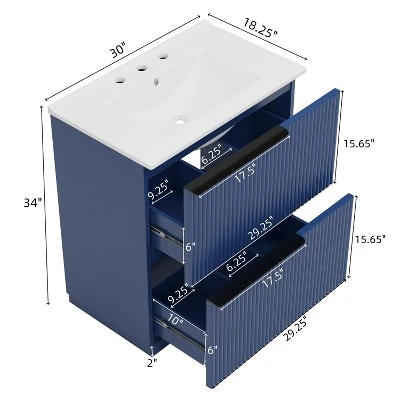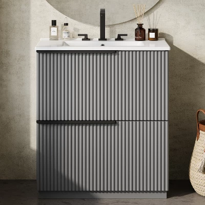 This bathroom vanity is designed for smart organization, featuring a dual-tier split-drawer system with central partitions that create distinct storage zones while preserving a sleek, unified exterior. The integrated bright white ceramic sink offers a glossy, non-porous surface that resists stains, scratches, and bacteria, with a deep basin that helps prevent splashing. Soft-close drawer slides ensure quiet, gentle operation, while deep 6″ drawers provide generous storage for bottles, towels, and essentials. The handcrafted fluted design adds sophisticated texture, with vertical grooves that resist fingerprints and smudges for lasting elegance and easy maintenance.