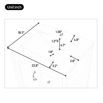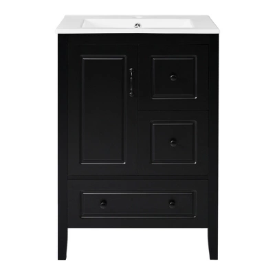 Bring vintage charm and modern convenience to your bathroom with this 24-inch freestanding vanity. Designed with a classic silhouette and black retro-style handles, it offers a timeless aesthetic. The integrated ceramic sink is easy to maintain, while soft-close drawers and cabinet doors keep your essentials organized and your bathroom peaceful. With a plumbing-friendly open back and simple assembly, this all-in-one unit makes upgrading your space effortless and elegant.