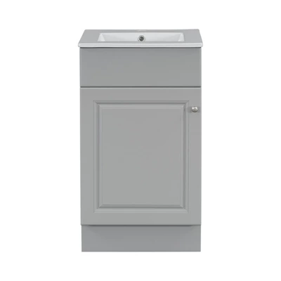 This compact and functional bathroom vanity is designed to maximize space while offering durability and style. Crafted from high-quality MDF, it ensures long-lasting performance. The ceramic sink is easy to maintain, while the painted finish adds an elegant touch and makes cleaning a breeze. The vanity features a spacious cabinet with a door to neatly store your bathroom essentials, keeping them organized and out of sight. Additionally, the built-in storage rack provides extra space for toiletries or accessories, while the adjustable shelf allows for customized organization, accommodating items of varying sizes. Perfect for smaller bathrooms or powder rooms, this vanity combines practicality with modern design, helping you maintain a tidy and stylish bathroom.