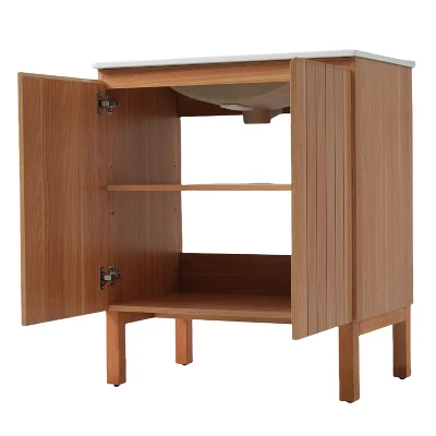 This 30-inch modern bathroom vanity combines vintage charm with minimalist design, featuring a natural wood finish that brings warmth and elegance to your space. The vertical stripe cabinet adds subtle texture, creating a timeless aesthetic that fits both contemporary and classic interiors. The high-quality ceramic sink offers durability with a glossy, stain-resistant surface and efficient water drainage. Soft-close hinges ensure quiet, smooth operation of the handle-free doors. With ample storage and a well-structured interior, this vanity keeps your bathroom organized. The freestanding design and easy plumbing access make installation a breeze.